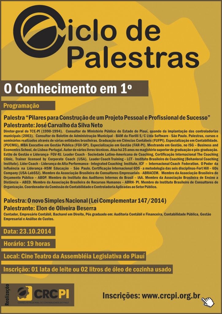 O evento será realizado no dia 23, no Cine Teatro da Assembleia Legislativa do Piauí, a partir das 19h. As palestras têm como tema: Pilares para Construção de um Projeto Pessoal e Profissional de Sucesso e O novo Simples Nacional. Os palestrantes são José Carvalho Neto e Elon Bezerra.