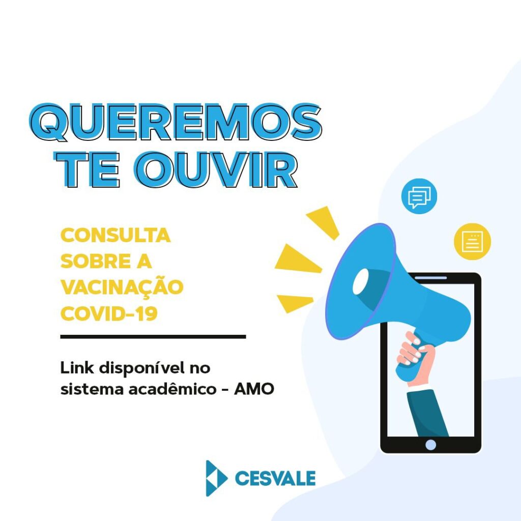 Cara comunidade acadêmica, a consulta a ser realizada é no intuito de acompanharmos o processo de vacinação da nossa comunidade acadêmica, fazendo parte das Ações da Comissão Própria de Avaliação – CPA contempladas no Plano de Contingência do CESVALE. Sua resposta é relevante para o encaminhamento das atividades da Instituição, desta forma contamos com vosso […]