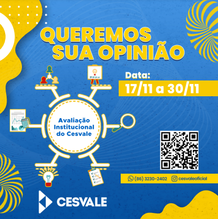 A faculdade Cesvale planeja antecipadamente suas atividades/eventos acadêmicos para todo o semestre, por meio do Calendário Acadêmico. Confira as atividades: Baixar o calendário: Calendário Cesvale