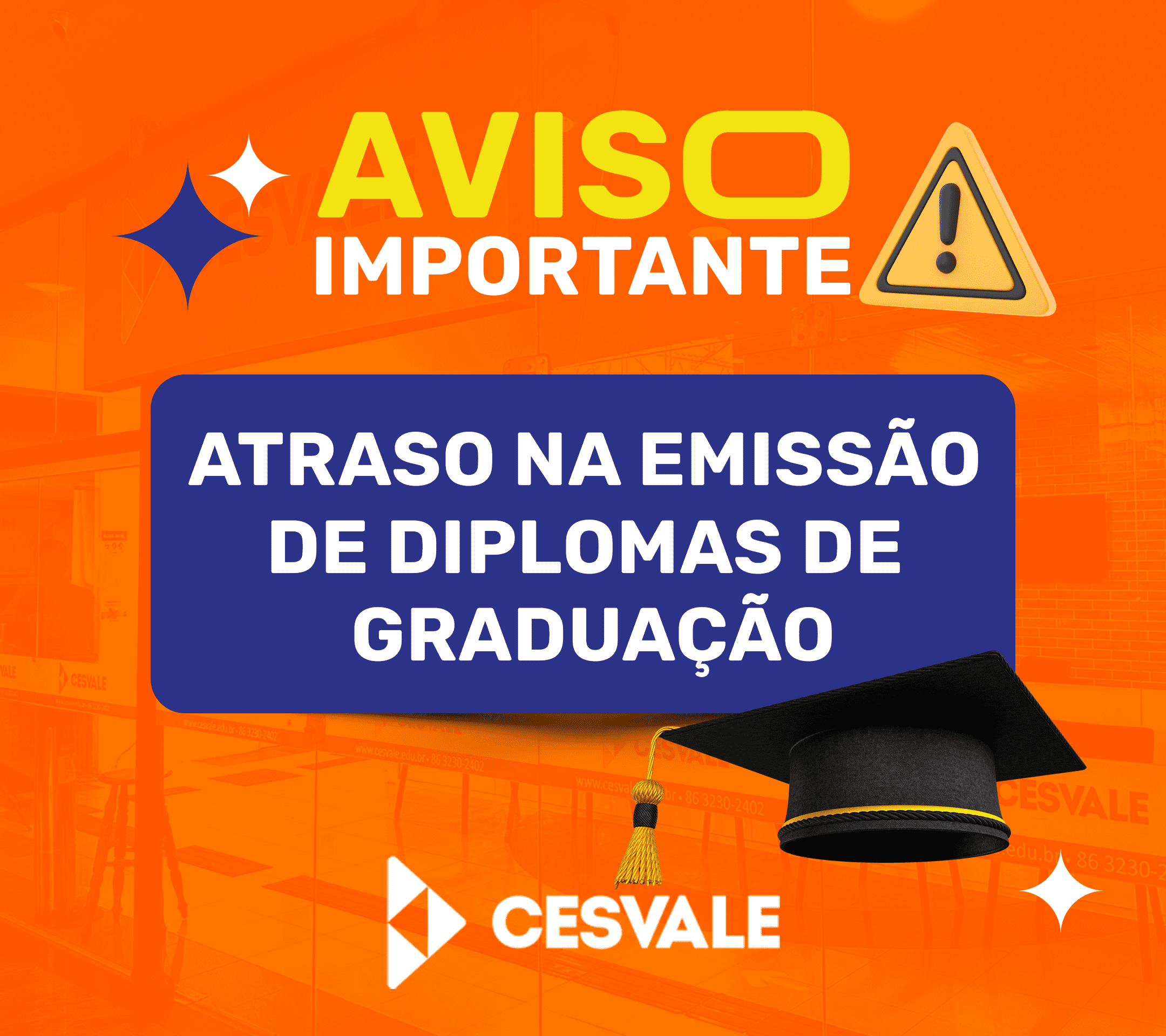 Gostaríamos de informar que, devido à greve por tempo indeterminado na Universidade Federal do Piauí (UFPI), instituição responsável pela chancela dos Diplomas de Graduação da Faculdade CESVALE, estamos enfrentando atrasos na emissão dos mesmos.