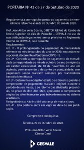 Art. 1º – O prolongamento do pagamento de mensalidade referente ao mês de OUTIBRO do ano de 2020, em caráter excepcional, decorrente a Pandemia COVID-19.