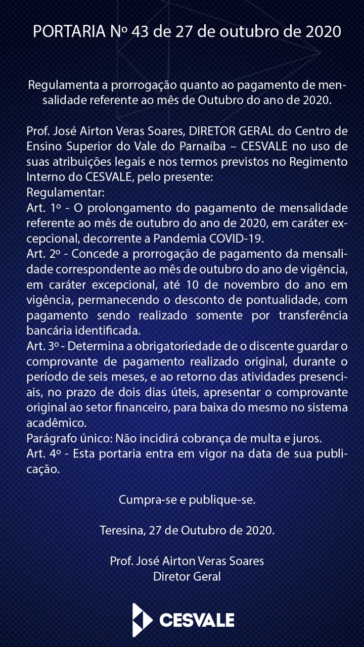 Prof. José Airton Veras Soares, DIRETOR GERAL do Centro de Ensino Superior do Vale do Parnaíba – CESVALE no uso de suas atribuições legais e nos termos previstos no Regimento Interno do CESVALE, pelo presente:
