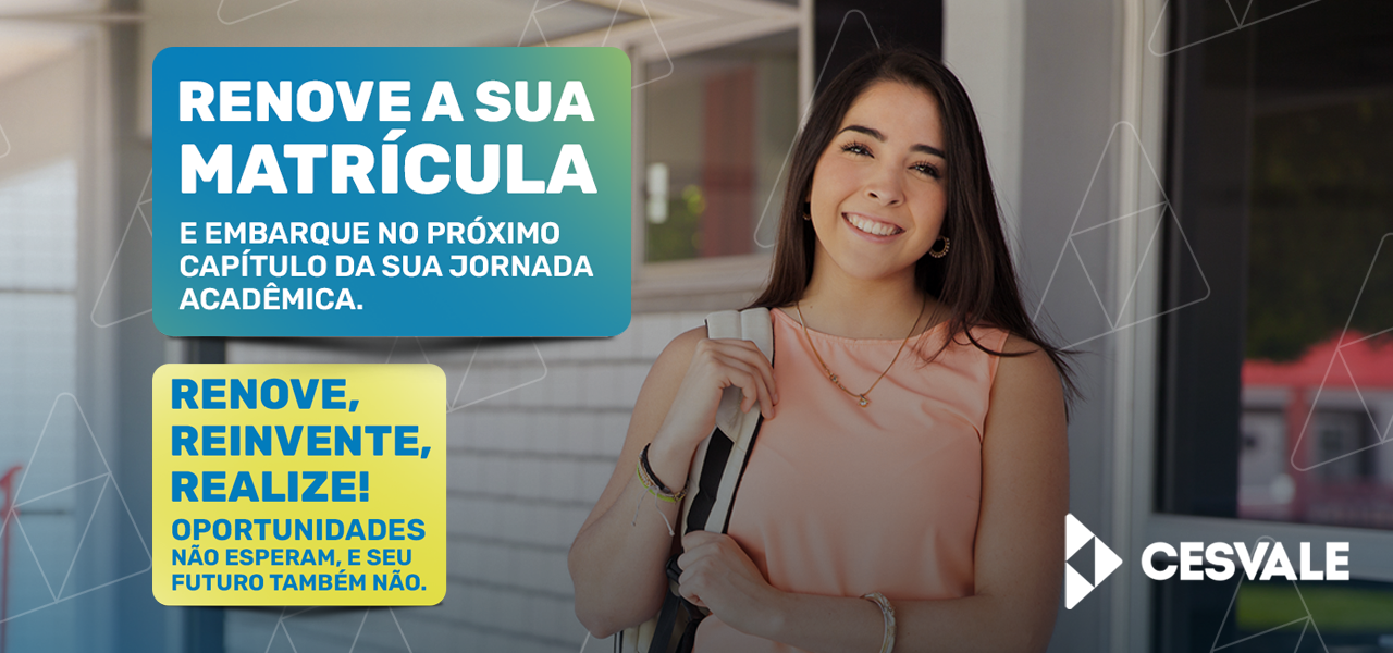 Desperte o protagonista que há em você! A partir do dia (02/01) de 2024, as rematrículas estão abertas no CESVALE. Renove seu compromisso com o sucesso, afirme seu lugar na comunidade acadêmica que valoriza o seu potencial.